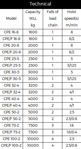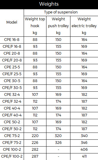 The CPE series is a range of high quality products for professional applications. They are highly efficient and engineered for a long working life. The hoists are composed of three main component parts which makes servicing easy and inexpensive.